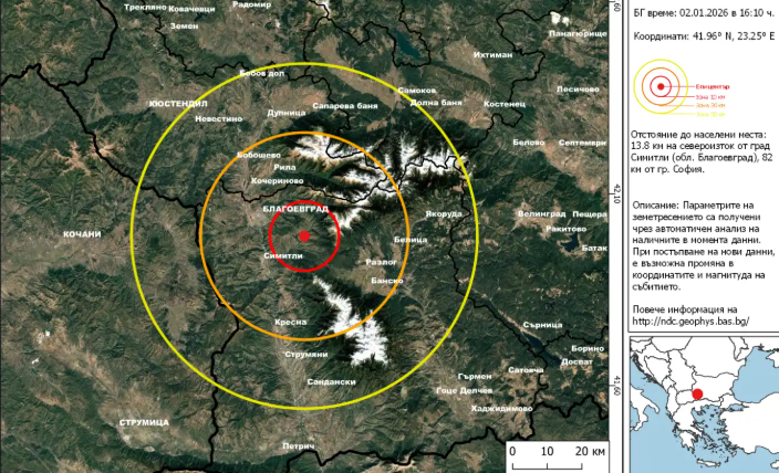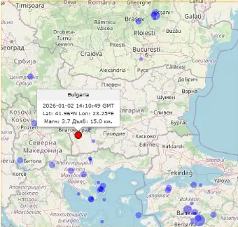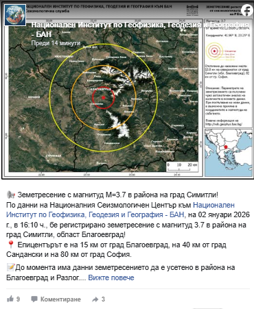 "02 януари 2026 г., в 16:10 ч., бе регистрирано земетресение с магнитуд 3.7 в района на град Симитли, област Благоевград!