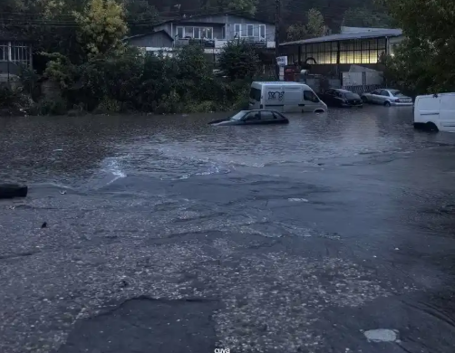 На видеа, разпространени от Meteo Balkans, се виждат коли, почти потънали във водата. Комбинацията от интензивни валежи и непочистени шахти превърна редица улици в истински реки, блокирайки трафика в сутрешния час пик.