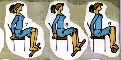 Седейки изправени, повдигайте единия крак, после другия, като държите всеки крак във въздуха за няколко секунди. Това упражнение ангажира големите мускули на бедрата, прасците и седалището, като помага за връщането на кръвта към сърцето и намалява напрежението върху кръвоносните съдове.