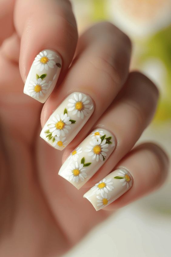 квадратен маникюр маргаритки