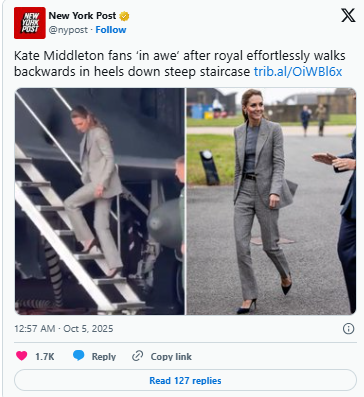 — Буквално съм в шок след това видео на принцесата на Уелс, която слиза по стълбите на токчета — написа човек в мрежата X, където видеото събра стотици хиляди гледания.