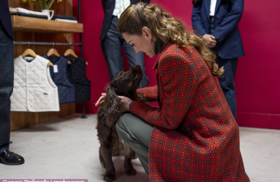 По време на престоя си в град Кардиган, където посети семейната компания за дънков текстил Hiut Denim, Кейт имаше възможност да се срещне с английски кокер шпаньол на име Барни.
