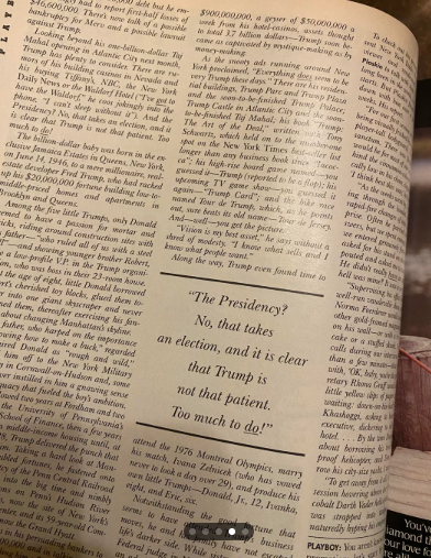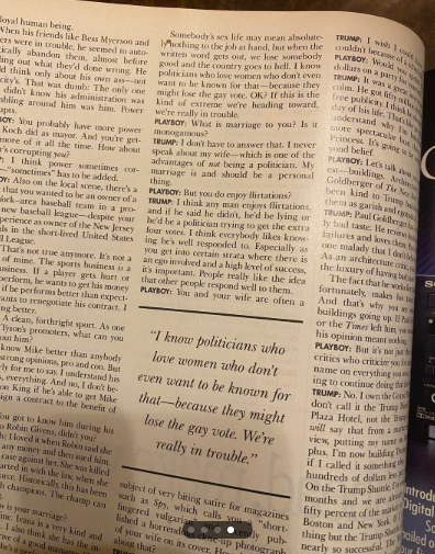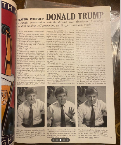 В броя е включено и дълго интервю със заглавие „Интервю с Playboy: Доналд Тръмп — откровен разговор с най-екстравагантния милиардер на десетилетието“. В него 43-годишният тогава бизнесмен говори за сделки, самореклама, политика и личния си живот.
