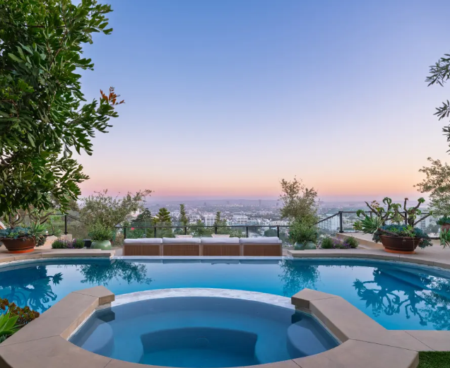 Външната площ включва басейн, градина, кът за сядане с камина и панорамна гледка от града към океана.