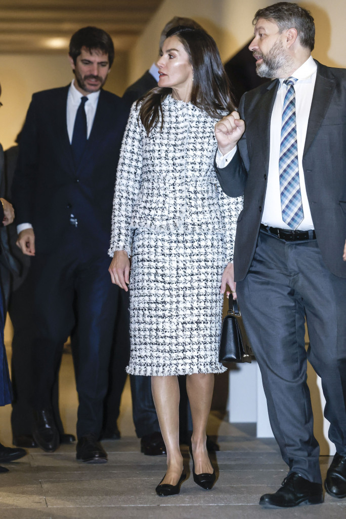 По този повод, на откриването на изложбата, посветена на кралица Виктория Евгения, и на срещата с фондация APRAMP, Летисия се появи в чисто нов костюм от туид от две части, изработен в сътрудничество с организацията, която тя непрекъснато подкрепя.