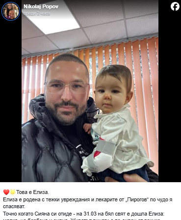 Бащата на трагично загиналата при катастрофа Сияна – Николай Попов – сподели нов емоционален пост в социалните мрежи, придружен от снимка, на която държи малко момиченце. Попов уточнява, че детето е Елиза – бебе, родено с тежки увреждания, но спасено по чудо от лекарите в „Пирогов“.