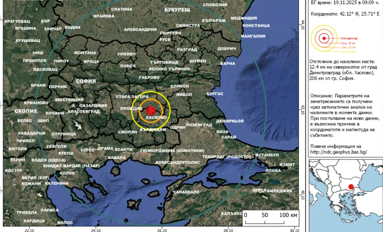 Епицентърът му е на 12 км от град Димитровград, а магнитудът му е 2,5 по Скалата на Рихтер.