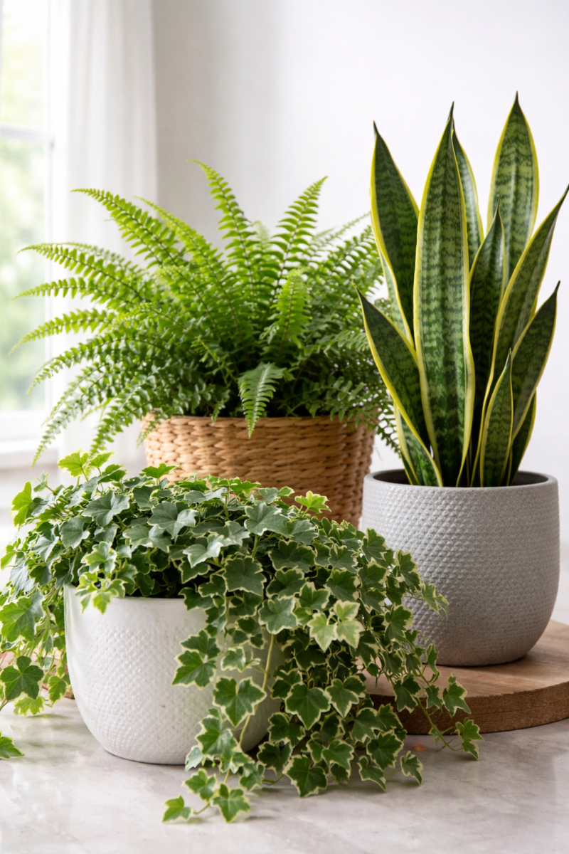 Английският бръшлян се отличава с особено ценни качества, тъй като може да улавя и абсорбира спори на мухъл от въздуха. Това го прави изключително подходящ за помещения, в които вече е имало проблеми с плесен. Бостънската папрат /Nephrolepis exaltata/, от своя страна, обича по-висока влажност и действа като естествен регулатор, особено в бани и кухни, където кондензът е най-силен. Сансевиерията е известна не само с непретенциозната си поддръжка, но и с това, че подобрява качеството на въздуха и подпомага баланса на влажността.