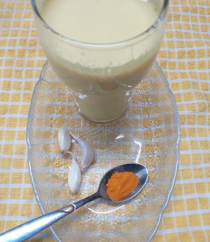 Смесете чесъна, куркумата и млякото в блендер.