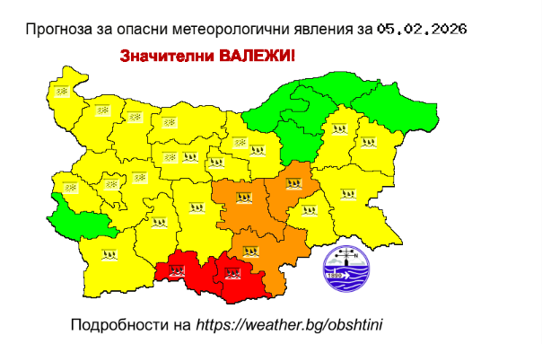 За 5 февруари 2026 г. Националният институт по метеорология и хидрология издава третата, най-висока степен на предупреждение – червен код, заради очаквани значителни валежи.