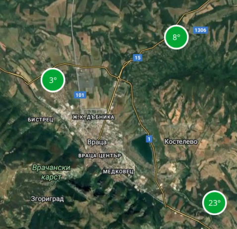 В две различни части на града, намираще са на около 10-15 км едно от друго са регистрирани едновременно 3 градуса и 23 градуса в две различни станции.