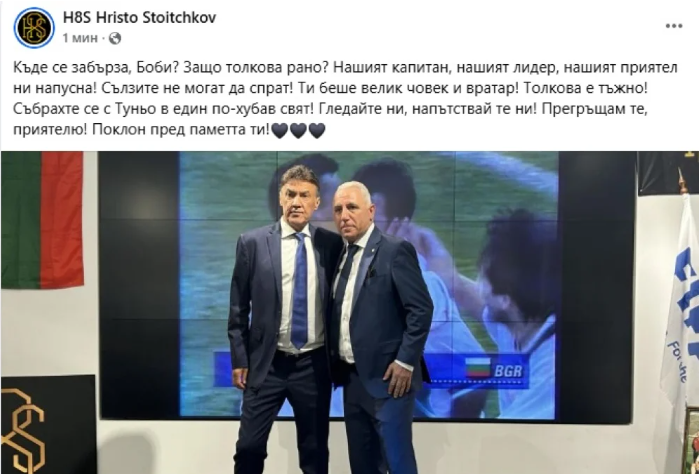 "Нашият капитан, нашият лидер, нашият приятел ни напусна! Сълзите не могат да спрат! Ти беше велик човек и вратар! Толкова е тъжно! Събрахте се с Туньо в един по-хубав свят! Гледайте ни, напътствай те ни! Прегръщам те, приятелю! Поклон пред паметта ти", добави Стоичков в публикацията си в социалните мрежи, публикувайки обща снимка с Боби Михайлов.