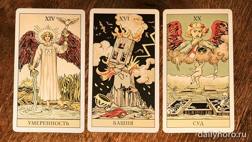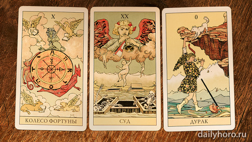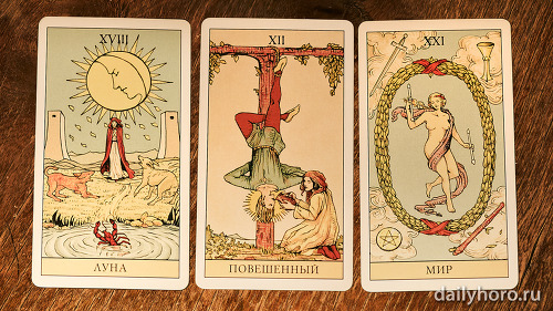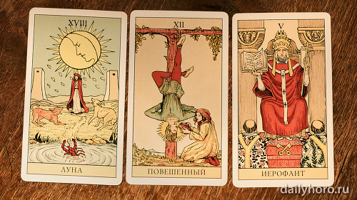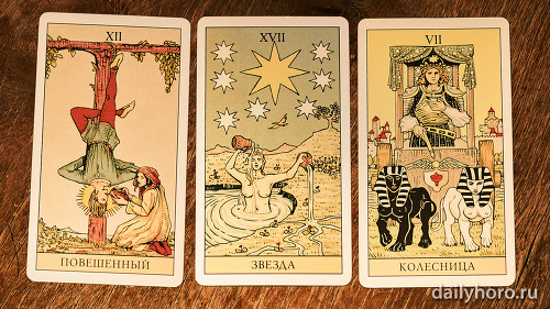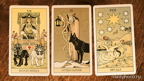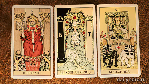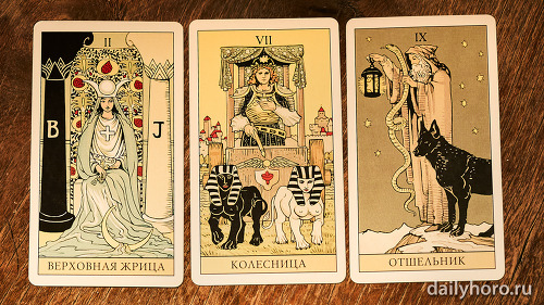 „Върховната жрица“ подсказва да се доверите на интуицията си. „Колесницата“ в средата носи движение и успех. „Отшелникът“ в края напомня да се отдръпнете, да анализирате и да възстановите силите си.