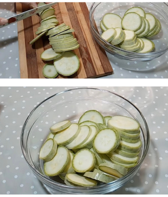 Измийте тиквичките, отстранете краищата им и ги нарежете на кръгчета с дебелина 2-3 мм. Сложете ги в дълбока купа. Добавете дафинов лист и скилидка чесън, нарязани на едро.