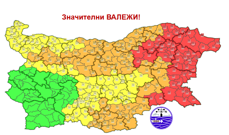 За още десет области – Русе, Велико Търново, Габрово, Плевен, Ловеч, Враца, Монтана, Сливен, Хасково и Кърджали – е обявен оранжев код, с очаквани валежи между 40 и 60 литра на квадратен метър.