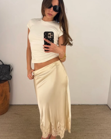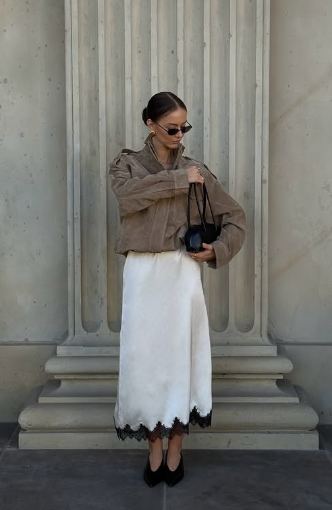 Сатенена или плисирана пола с обикновена бяла риза изглежда модерно, стилно и далеч по-луксозно, отколкото прекалено натруфените комбинации.
