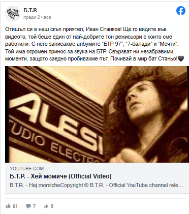 От бандата публикуваха послание, в което изразиха болката си от загубата на човек, когото наричат не просто професионалист, а истински приятел. Те припомниха, че именно с Иван Станков зад пулта се раждат албуми като БТР 97, 7 балади и Мечти – проекти, които и до днес се смятат за ключови в тяхната дискография. Музикантите го определиха като един от най-талантливите и всеотдайни тонрежисьори, с които са имали възможност да работят през годините.
