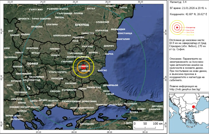 Данните са на НИГГГ към БАН. Първият от тях е от сряда вечерта в 20:41, край Стралджа, който е с по-висок магнитуд - 3,4 по Скалата на Рихтер и дълбочина 14 км.