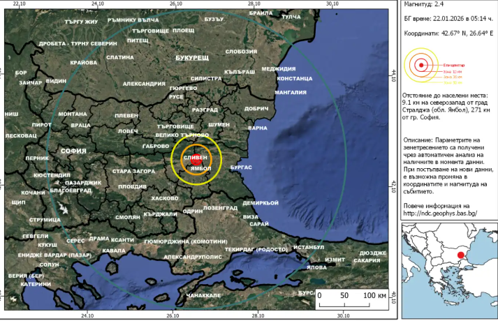 Вторият трус е от 5:14 часа с епицентър отново в близост до град Стралджа, област Ямбол, а магнитудът му е 2,4 по Скалата на Рихтер.
