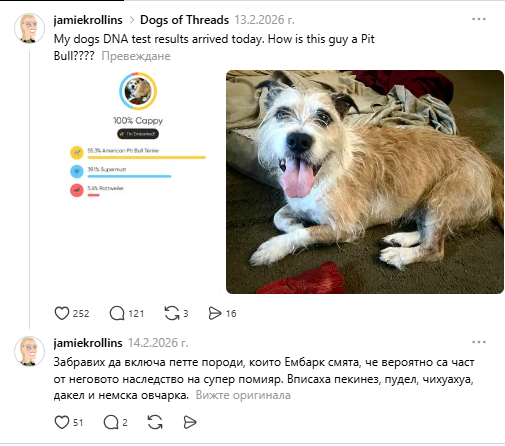 Под публикацията много собственици на кучета споделят сходни истории с изненадващи ДНК тестове. Някои отбелязват, че при питбулите съществува рецесивен ген за по-груба или по-дълга козина, което би могло да обясни пухкавия вид на Капи.