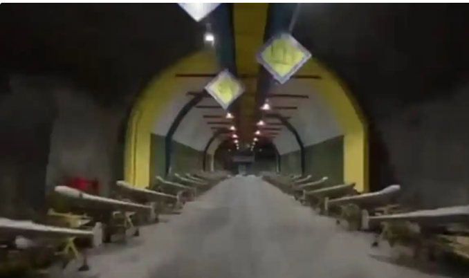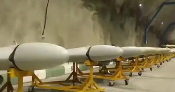 На кадрите се виждат дълги линии от дронове Shahed drones, както и ракети, подредени в тунели.