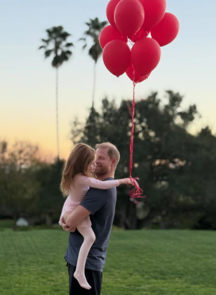 В едната си ръка Лилибет държи връзка с червени балони, а с другата се е сгушила в принц Хари. Под снимката Меган написа: „Тези двамата + Арчи = моите вечни валентинки“, визирайки съпруга си и двете им деца. 6-годишният принц Арчи не присъства в кадъра.