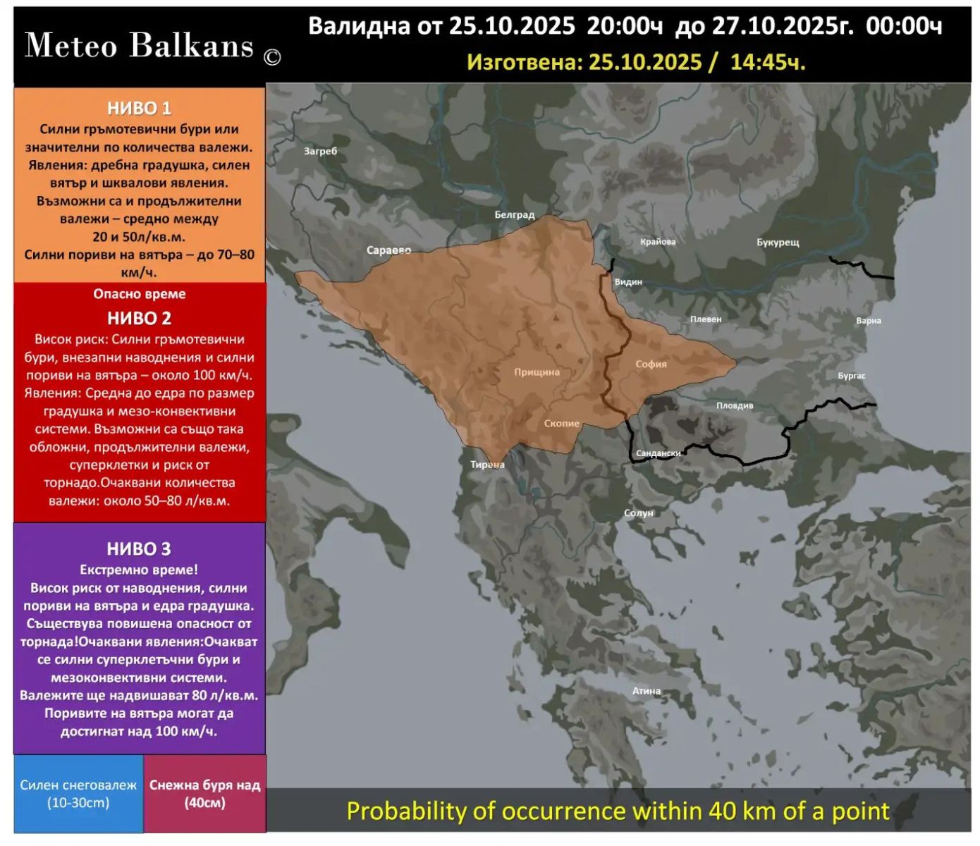 Екипът на Meteo Balkans издаде карта с предупреждения за лошо време , валидна за периода 25–27 октомври 2025 г. .