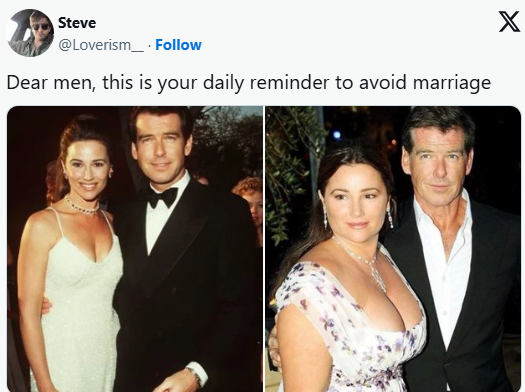 А именно, анонимен потребител публикува снимки на Пиърс Броснан и съпругата му Кийли Смит, с посланието, че те са „напомняне на мъжете, че трябва да избягват брака“.