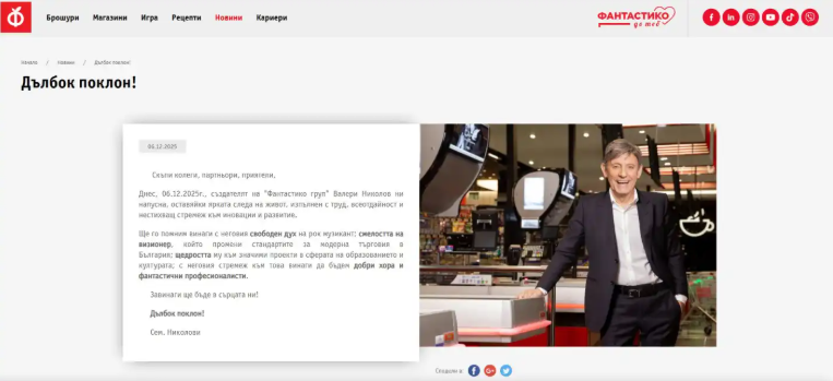 „На 06.12.2025 г., създателят на „Фантастико груп“ Валери Николов ни напусна, оставяйки ярка следа на живот, изпълнен с труд, всеотдайност и нестихващ стремеж към иновации и развитие“, съобщават от семейството.