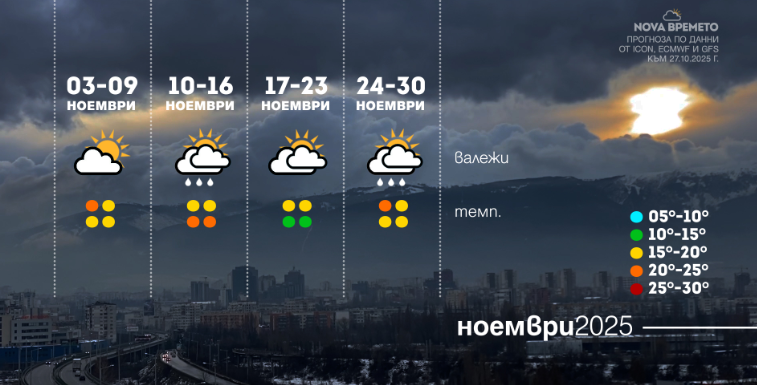Ранните синоптични анализи сочат, че ноември ще се окаже по-сух и по-топъл от обичайното, като метеоролозите предупреждават за стабилен антициклонален режим почти през целия месец. Тази особеност може да доведе до продължителни периоди на мъгли, особено в ниските райони и около водоемите, както и до задържане на фини прахови частици във въздуха — често срещано явление при такава синоптична конфигурация.