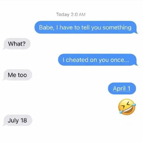 Един мъж решил да се пошегува с момиче, като ѝ изпратил съобщение: „Имам да му призная нещо.“ Когато тя го попитала за какво става въпрос, той написал, че ѝ е изневерил .